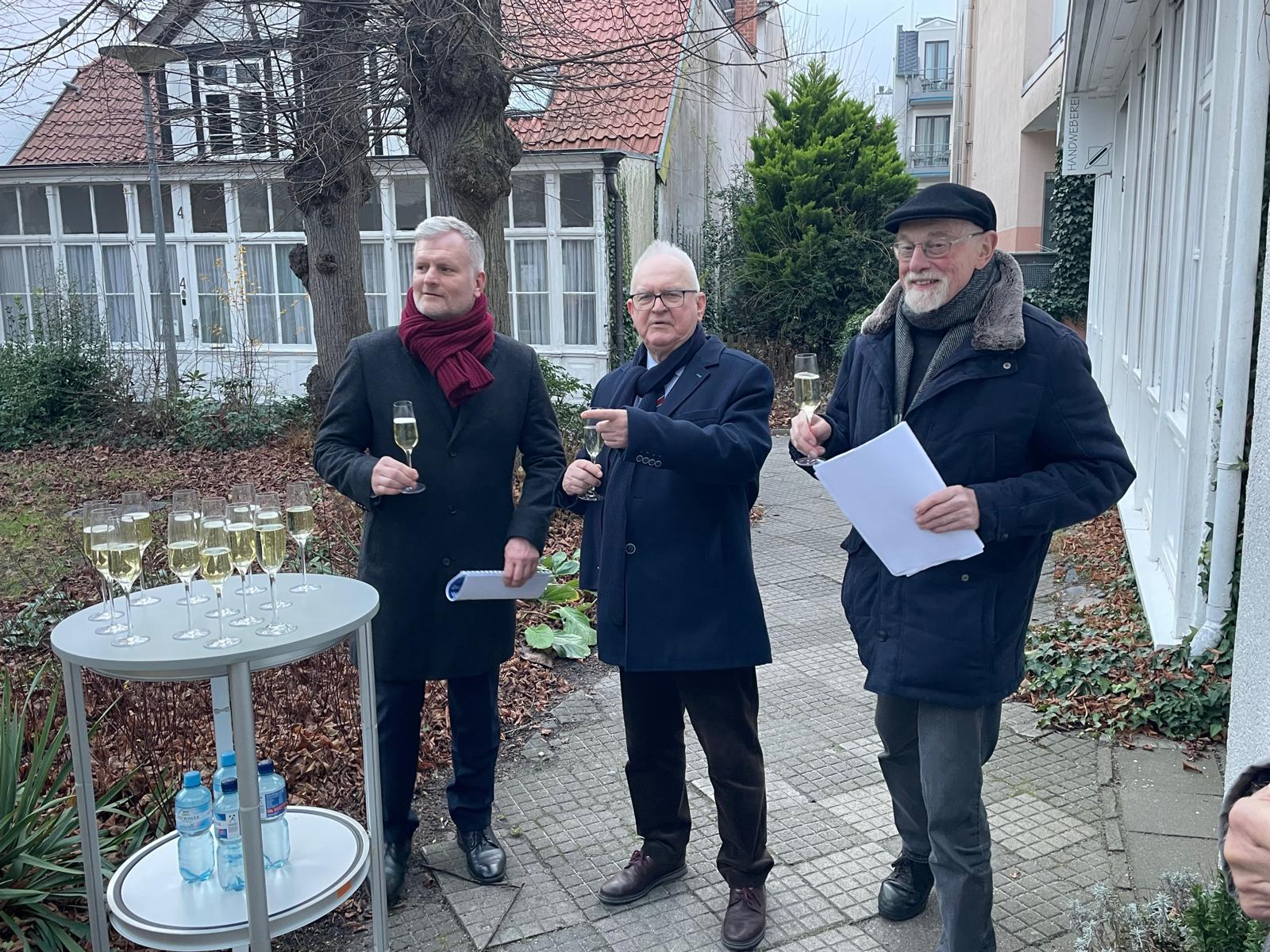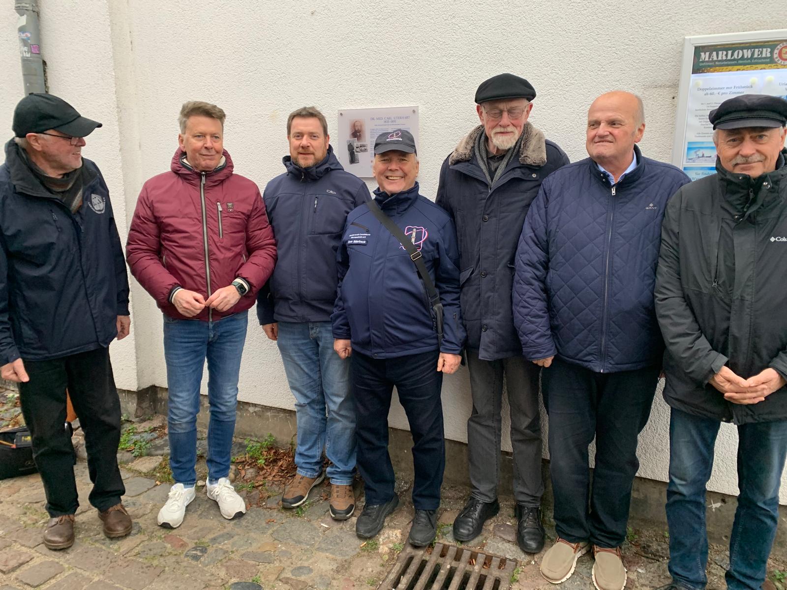 Am Haus 67 knall­te der Sekt­kor­ken, denn Prof. Dr. Klaus-Peter Schmitz , Direk­tor vom Insti­tut für Implan­tatt­ech­no­lo­gie und Bio­ma­te­ria­li­en e. V., ließ es sich nicht neh­men, mit Män­nern des Leucht­turm­ver­eins, mit Rota­ri­er-Freun­­den, Bewoh­nern die­ses Plat­zes und Mit­glie­dern ver­schie­de­ner Ver­ei­ne auf sei­nen Vater anzu­sto­ßen. Die­sem war heu­te die Pla­ket­te gewid­met.