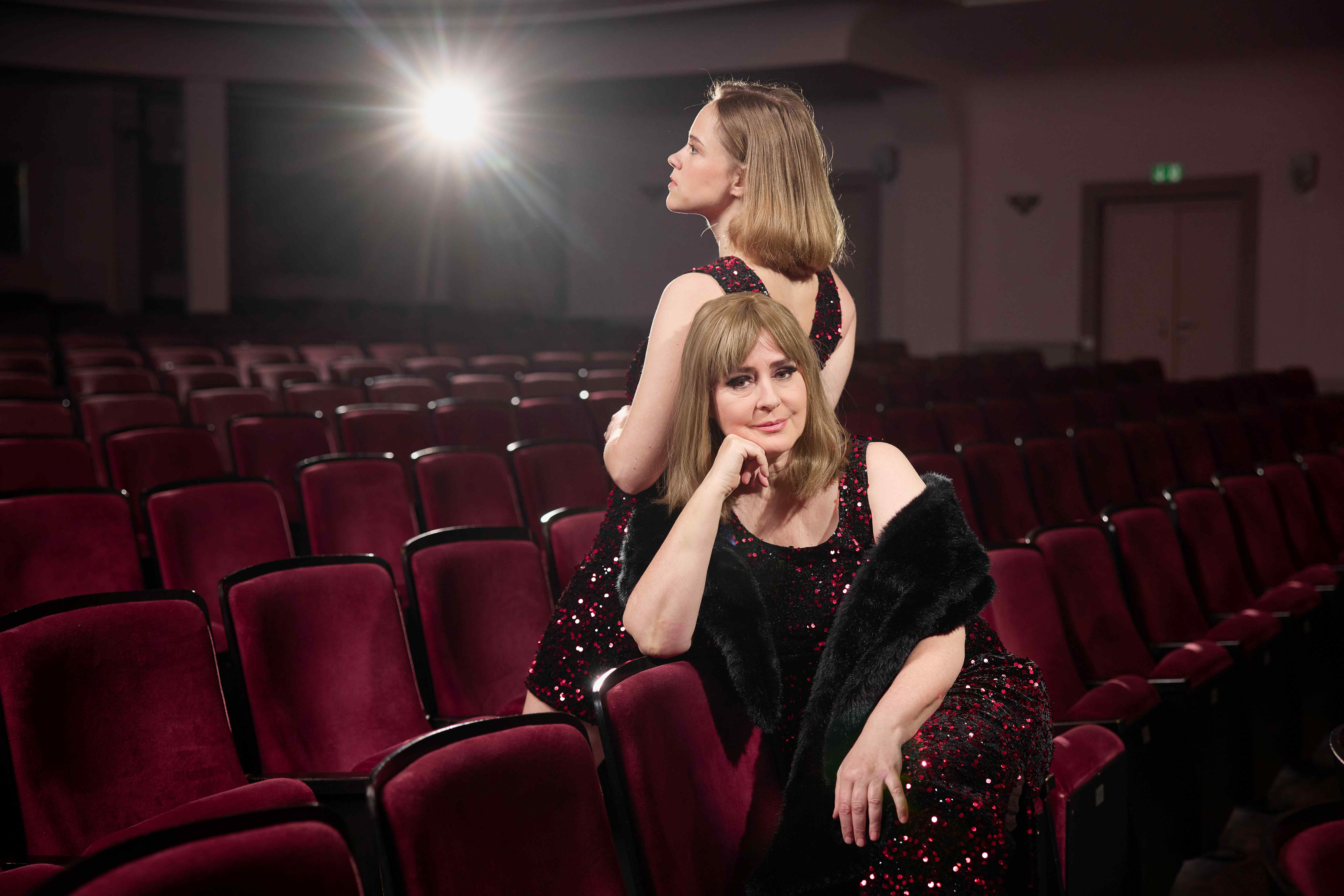 Eine Hom­mage an Hil­de­gard Knef ist die musi­ka­li­sche Zeit­rei­se, Fol­ge 7, mit Kat­rin Hel­ler und Katha­ri­na Otte, zu der sich am 30. Janu­ar der Pre­mie­ren­vor­hang in der Klei­nen Komö­die geho­ben hat.  Foto: Tho­mas Man­dt